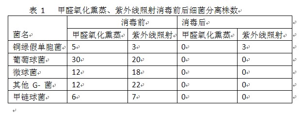 4.3紫外线照射消毒法 在各医院较广泛地应用其杀菌原理是紫外线光使微生物的 DNA 产生诱变和致死。但紫外线照射强度及消毒效果受多种因素影响 ,从表 1 两种消毒效果比较可知甲醛氧化熏蒸消毒优于紫外线照射消毒法。甲醛氧化熏蒸消毒效果显著 ,取材方便、制作简单 ,置入箱内消毒不受其他条件影响。此方法在基层医院更具有实用性。
